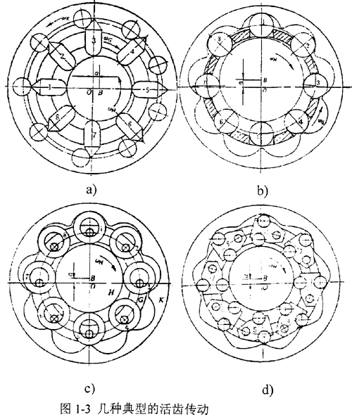 活齒傳動,全稱為“活齒少齒差行星齒輪傳動”,是一種由K-H-V 型少齒差行星齒輪傳動演化而成的一種新型齒輪傳動。它的特點(diǎn)是固定輪上的齒形制成圓弧或其他曲線,行星輪上的各輪齒改用單個的活動構(gòu)件(如滾柱)代替,而這些構(gòu)件分別置于輸出軸上沿周向分布的槽孔中,當(dāng)主動偏心構(gòu)件(波發(fā)生器)驅(qū)動時,它們將在槽孔中活動,故稱為“活齒”。常見的活齒傳動分為推桿活齒傳動(圖1-3a)、滾柱(鋼球)活齒傳動(圖1-3b)、套筒活齒傳動(圖1-3c)、擺動活齒傳動(圖1-3d)等;铨X結(jié)構(gòu)形式最初是由德國人于30 年代提出的,40 年代德國將活齒傳動技術(shù)應(yīng)用于汽車的轉(zhuǎn)向機(jī)構(gòu)中。60 年代前后,美國、前蘇聯(lián)、英國、聯(lián)邦德國等國都先后開展了研究工作。前蘇聯(lián)研究了“柱塞傳動”(活齒傳動的一種型式),提出了它的運(yùn)動分析和力分析的計算方法。美國學(xué)者提出了推桿活齒減速器傳動裝置,分析了傳動原理,對傳動比和作用力進(jìn)行了計算,分析了其傳動性能。英國推出了“滑齒減速器”。80年代,前蘇聯(lián)學(xué)者HLHATHIIIeB.P.M推出了另一種活齒傳動形式即“正旋滾珠傳動”,并研究了正旋滾珠活齒傳動的嚙合理論、強(qiáng)度特性、走和性能等。前蘇聯(lián)還將正旋滾珠減速器用于石油鉆探中,成功地解決了渦輪鉆具轉(zhuǎn)速過高的難題。英國也曾對活齒傳動減速器進(jìn)行了系列生產(chǎn),單給傳動的傳動比為20~80,效率為86%~87%,也有雙級和三級傳動,功率N<25馬力。80年代才真正開始的,1986年北京航空學(xué)院陳仕賢教授提出了推桿活齒針齒輪減速機(jī),其結(jié)構(gòu)與樣機(jī)于同看獲日內(nèi)瓦國際發(fā)明博覽會金獎。1987年,周有強(qiáng)教授等人提出了套筒活齒少齒差傳動并申報了國家專利。麻彪對套筒活齒少齒差傳動提出了一種改進(jìn)的結(jié)構(gòu)方案。1988年曲繼方教授提出了軸向活齒傳動的一種結(jié)構(gòu)形式及齒形設(shè)計方法,同時提出了另一種新型活齒傳動裝置-擺動活齒減速機(jī)并申報國家專利。90年代,江陰東亞減速機(jī)廠的嚴(yán)明工程師提出了一種新結(jié)構(gòu)活齒傳動-移位滾柱減速機(jī),該項技術(shù)獲國家專利并在全國發(fā)明博覽會和北京國際博覽會上均獲得銀獎。此外,我國學(xué)者還獲得了滾道減速機(jī)(CN 86 200768U)、密切圓活齒傳動、變速傳動軸承(CN 85 200923U)等多種專利技術(shù)。