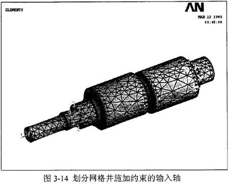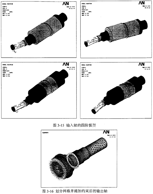 模型采用IGES格式導(dǎo)入,拓?fù)湫扪a(bǔ)后選擇單元為solid45,指定楊氏模量為2.06×1011N/m2,密度為7800kg/m2,泊松比為0.3。采用自由網(wǎng)格劃分,劃分精度為7 。劃分網(wǎng)格并施加約束的輸入軸見圖3-14。選擇Block Lanczos特征值求解器,指定擴(kuò)展模態(tài)數(shù)為4,頻率范圍為O~8000Hz。求得輸入軸的前四階固有頻率為2476Hz、2493Hz、3164Hz、3193Hz,對應(yīng)的振型見圖3-15。