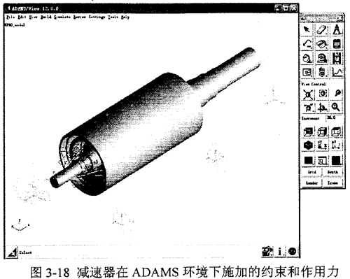 將Pro/ENGINEER建立起來的減速器三維裝配實(shí)體模型通過Mechpro接口程序?qū)階DAMS,對其添加約束和作用力情況見圖3-18,其中: