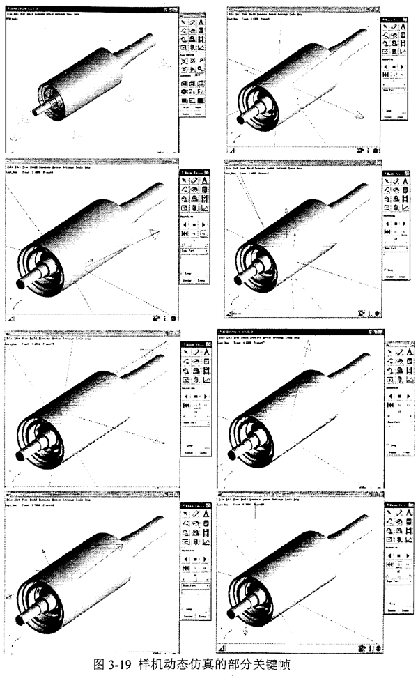仿真開始后,ADAMS-View自動調(diào)用ADAMS-Solver進(jìn)行求解,并實(shí)時地將每一幀顯示在屏幕上,形成動畫。仿真過程的部分關(guān)鍵幀見圖3-19。