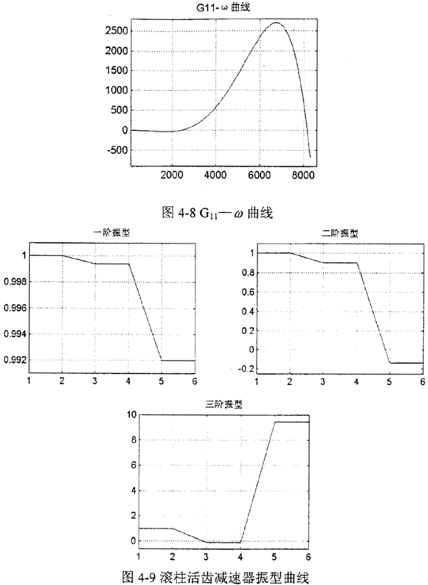 根據(jù)前面介紹的方法,在計算機上編程對減速器的扭振動力學特性進行分析,其程序框圖見圖4-7所示。在計算機上運算時,按照確定的頻率步長對頻率方程掃頻,作出“G11-ω”曲線,如圖4-8所示,凡G22=0時的ω值,就是系統(tǒng)的固有頻率。有關固有頻率、勢能分布率和模態(tài)柔度的計算結(jié)果見表4-2。另外,利用該程序還繪制出圖4-9所示的減速器系統(tǒng)的振型曲線。