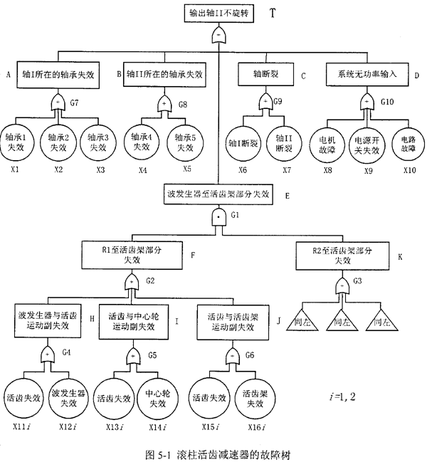 在系統(tǒng)可靠性研究方法中,故障樹分析(FTA)是一種用于復(fù)雜系統(tǒng)可靠性和安全性分析的有效方法,它可以全面清晰地反映各種故障原因與系統(tǒng)故障的關(guān)系及每一種可能故障的傳遞途徑,為設(shè)計、管理和維修復(fù)雜系統(tǒng)提供了一種形象的圖解,指導(dǎo)人們?nèi)ゲ檎蚁到y(tǒng)故障,改進(jìn)和強(qiáng)化系統(tǒng)的關(guān)鍵部分。在己知基本事件可靠性數(shù)據(jù)的基礎(chǔ)上,通過故障樹分析,人們可以快速地找出系統(tǒng)的薄弱環(huán)節(jié),以進(jìn)一步改進(jìn)設(shè)計和提高關(guān)鍵件的可靠度,從而提高整個系統(tǒng)的可靠性。本章在分析滾柱活齒減速器系統(tǒng)結(jié)構(gòu)及其功能關(guān)系的基礎(chǔ)上,建立滾柱活齒減速器的故障樹模型,確定系統(tǒng)的最小割集,并根據(jù)建立的故障樹中各事件之間的邏輯關(guān)系以及布爾代數(shù)的運(yùn)算法則,求出滾柱活齒減速器功能破壞即“輸出軸不旋轉(zhuǎn)”這一頂事件的故障概率。