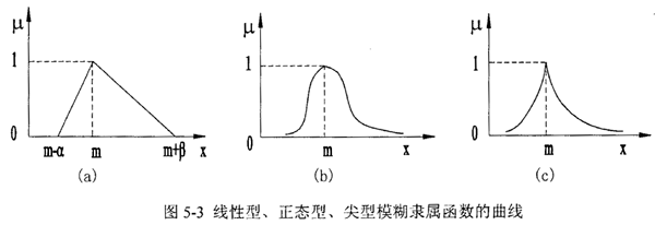 線性型參照函數(shù)在“完全屬于”和“完全不屬于”之間的中介狀態(tài)是線性變化的(見圖5-3a),當(dāng)x≤m-α和x≥m+β時,μ=0,說明在(m-α, m+β)區(qū)間之外的數(shù)值完全不屬于該模數(shù)數(shù),而其他類型的隸屬函數(shù)曲線兩端延伸到無窮遠(yuǎn)(圖5-3b,c),說明整流器個數(shù)軸上的任何數(shù)總在一定程度上隸屬于該模數(shù)數(shù)。在選擇參照函數(shù)時,除非有絕對的擾握認(rèn)為該事件發(fā)生的概率在某個范圍之間而選擇線性參照函數(shù),否則,以選取正態(tài)型或尖型為好。