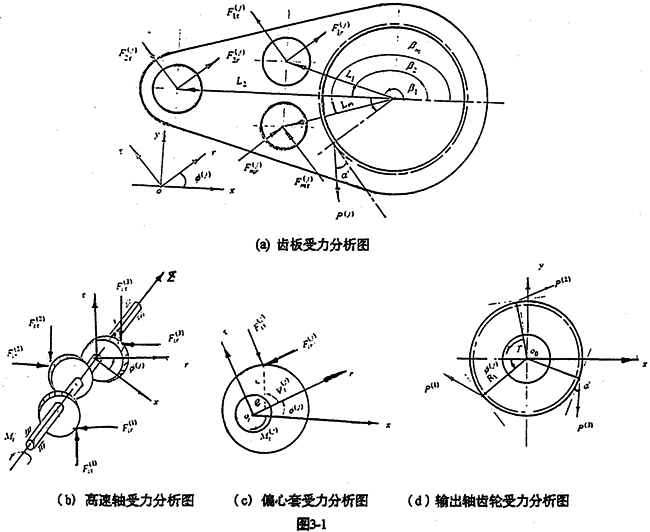 由于多相并列內齒行星傳動的N片行星齒板結構相同,相鄰兩片之間的相位差為2Ω/N。因此,在一個周期范圍內,各片齒板的受力情況完全一樣,故只需分析其中一片齒板即可。齒板及高速軸、輸出軸的受力分析如圖3-1所示。用動態(tài)靜力平衡法寫出機構的動力分析基本方程為