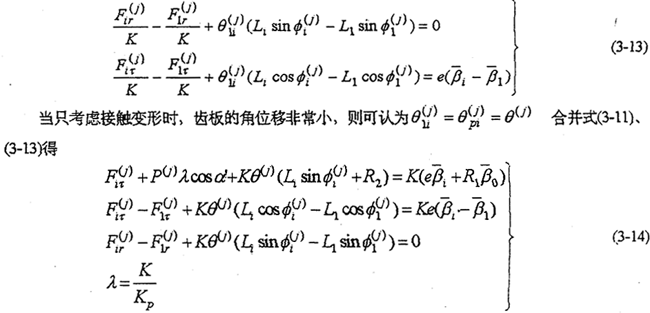 在建立位移協(xié)調補充方程時,為便于分析,忽略機構的運動副間隙,并且只考慮偏心套與齒板高速軸孔之間的接觸變形,以及齒板與輸出齒輪輪齒之間的嚙合變形。由式(2-33)、(2-34)及式(2-35)、(2-36)、(2-37)得: