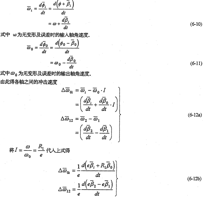 由于減速器機構(gòu)的變形及各構(gòu)件的誤差,使各傳動軸的角速度及角加速度不再滿足條件式(6-8)及式(6-9),亦在運轉(zhuǎn)過程中各軸之間存在角速度及角加速度的沖擊現(xiàn)象。該沖擊將直接導(dǎo)致系統(tǒng)振動,使輸出速度產(chǎn)生波動、降低其輸出的穩(wěn)定性,并產(chǎn)生沖擊載荷。