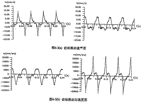 圖6-4是支承軸軸承座及輸出軸軸承座的振動速度及振動加速度時域圖。圖(c)中,一個周期內(nèi)的三根較長的沖擊棒線分別是三相機構(gòu)因死點引起的嚙合沖擊。軸承座的振動速度比齒板的振動速度小,但振動加速度比齒板振動加速芳略大,最大值為