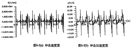圖6-5是輸入軸與輸出軸之間產(chǎn)生的角速度及角加速度沖擊的時域曲線。從圖可以看出兩軸在機構(gòu)死點位置,振動的沖擊速度及沖擊加速度均很大。