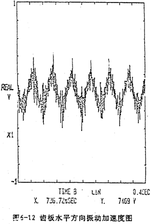 由于機(jī)構(gòu)過(guò)死點(diǎn)時(shí),因變形要引起死點(diǎn)沖擊,可以通過(guò)死點(diǎn)位置及其附近的輪齒(齒板)進(jìn)行修形,使三相載荷均衡化。圖6-23是將死點(diǎn)位置輪齒修形后,軸承座的振動(dòng)加速度圖。與圖6-21(a)比較,總體幅值明顯下降。