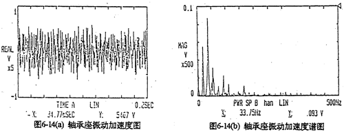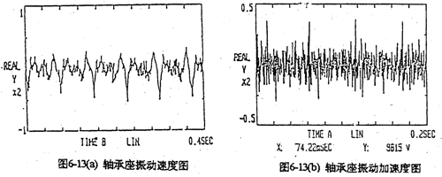 由于每片齒板都存在同樣的周期性激勵(lì)沖擊函數(shù),相位差120°,迭加后的總效果仍然是轉(zhuǎn)頻周期函數(shù)。因此對(duì)箱體軸承座的沖擊也呈周期性。圖6-13是支承軸箱體軸承座的振動(dòng)速度及加速度的實(shí)測(cè)時(shí)域曲線圖。其曲線圖的變化規(guī)律及幅值與圖6-4完全接近。速度及速度沖擊值為v