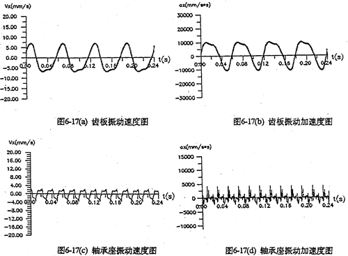 采用雙軸輸人的齒板及箱體軸承座振動(dòng)速度、加速度如圖6-17所示。從圖看出齒板速度及加速度值明顯變。閱屋S輸人時(shí)的0.3倍),而且無(wú)沖擊,完全屬于穩(wěn)太振動(dòng)。箱體的振動(dòng)速度及加速度幅值只是單軸輸人時(shí)的0.2倍。圖6-18a是一軸的偏心套存在0.05度的分度誤差時(shí)齒板的加速度曲線圖,圖中明顯出現(xiàn)加速度沖擊棒線。采用雙軸輸入后,死點(diǎn)沖擊被徹底(見(jiàn)圖6-18b) , 變成穩(wěn)態(tài)振動(dòng)曲線了。因此,為了減小三環(huán)減速器的振動(dòng),有必要加大三環(huán)減速器的橫向尺寸,在箱體內(nèi)增加一套雙軸輸入的齒輪功率分流機(jī)構(gòu),或者在箱體外另設(shè)計(jì)一套功率分流機(jī)構(gòu),以解決機(jī)構(gòu)過(guò)死點(diǎn)的振動(dòng)問(wèn)題。
