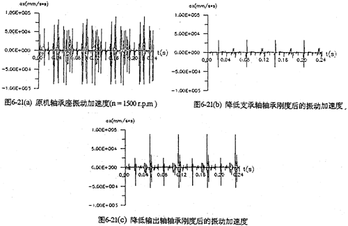 降低箱體軸承剛度是為了吸收內(nèi)部機(jī)構(gòu)對(duì)箱體的沖擊振動(dòng),減小沖擊幅值。圖6-21是轉(zhuǎn)速為1500(rpm)即時(shí)分別將支承軸及輸出軸的箱體軸承與軸之間加一3mm的彈性墊圈時(shí),計(jì)算出的箱體振動(dòng)加速度曲線。從圖中看出,減小支承軸箱體軸承剛度比減小輸出軸箱體軸承的效果更明顯。