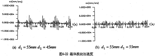 增加高速軸的剛度是降低沖擊載荷的重要途徑。軸的剛度大(值徑大),扭轉(zhuǎn)、彎曲變形小,雙曲柄機(jī)構(gòu)變形也就小,這樣既減小了沖擊振動(dòng)、又增加了軸的強(qiáng)度。圖6-22將高速軸的直徑由原來(lái)的45mm加到55mm后的,振動(dòng)加速度圖。