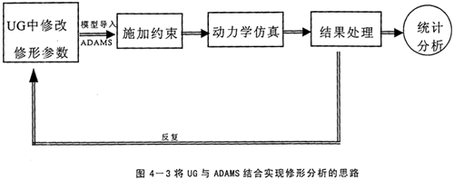 前面已經(jīng)以擺線傳輸線的參數(shù)化建模為例,闡述了UG的強(qiáng)大的基于特征的參數(shù)化造型功能,既然用子程序的方式實(shí)現(xiàn)不了,將UG的該功能加以充分利用,也可以實(shí)現(xiàn)優(yōu)化修形的目的。實(shí)現(xiàn)的途徑是在建造擺線輪的表達(dá)式中考慮修形量△Rz與△r,這樣就建造了修形后的擺線輪,同時(shí)△Rz與△r是隨機(jī)可調(diào)的變量,可以得到任意組合的修形方式。并且UG的數(shù)據(jù)存儲(chǔ)具有單一數(shù)據(jù)庫的特點(diǎn),零件圖中修改后,裝配圖及工程圖全都自動(dòng)更新,不用人工去費(fèi)時(shí)修改。然后,再將總裝配模型導(dǎo)入到ADAMS中施加約束。執(zhí)行仿真。這樣就得到多組修形組合的仿真結(jié)果,經(jīng)過統(tǒng)計(jì)分析就可得到最佳的修形組合。具體思路如下圖所示。