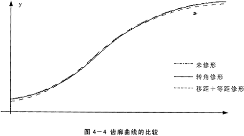 采用這種方法加工擺線輪時(shí),磨齒機(jī)的調(diào)整和加工標(biāo)準(zhǔn)齒廓時(shí)相同,只是在磨出標(biāo)準(zhǔn)齒廓以后,將分齒機(jī)構(gòu)和偏心機(jī)構(gòu)的聯(lián)系脫開,然后撥動(dòng)分齒掛輪上的齒輪,使工作臺(tái)轉(zhuǎn)過一微小的角度δ,從而改變了擺線輪在上一次磨削時(shí)的初始位置。這樣重新磨削后,就得到一條與標(biāo)準(zhǔn)齒廓基本上一樣的齒廓,僅整個(gè)輪齒變瘦一些,而齒間變大一些;其特點(diǎn)是同時(shí)嚙合齒數(shù)較多,但擺線輪的齒頂和齒根圓直徑?jīng)]有變化,該處與針齒相嚙合時(shí)沒有間隙存在,因此不能單獨(dú)使用轉(zhuǎn)角修形法。