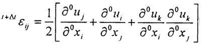 上式是將t+△t時(shí)刻的應(yīng)力、應(yīng)變、位移看成t時(shí)刻已知的應(yīng)力、應(yīng)變、位移和未知增量應(yīng)力{0S},應(yīng)變{0ε},位移{0u}之和,進(jìn)一步,增量應(yīng)變{0ε}可用線性部分即{oε}={oe}+{oη}