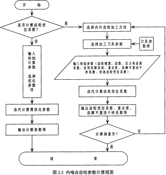 在少齒差內(nèi)嚙合傳動(dòng)中,變位系數(shù)的確定是設(shè)計(jì)的關(guān)鍵。齒輪的實(shí)際幾何尺寸與齒輪的加工方法有直接的關(guān)系,所以用不同的齒輪加工方法的計(jì)算公式來推導(dǎo)變位系數(shù)的迭代公式,所得迭代結(jié)果不一樣。內(nèi)嚙合齒輪參數(shù)計(jì)算模塊中,已經(jīng)由公式(2.5)~(2.9)推導(dǎo)了少齒差內(nèi)嚙合傳動(dòng)的各種實(shí)際加工情況下的變位系數(shù)的計(jì)算迭代公式,圖(2.3)為齒輪變位系數(shù)計(jì)算框圖。