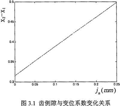 由3.2圖可以看出,當(dāng)齒側(cè)隙jn由0變化至.25毫米時(查資料取較大最小側(cè)隙參考值),齒輪變位系數(shù)差X2-X1的變化量由近0.32變化到0.50,變化了約0.18。