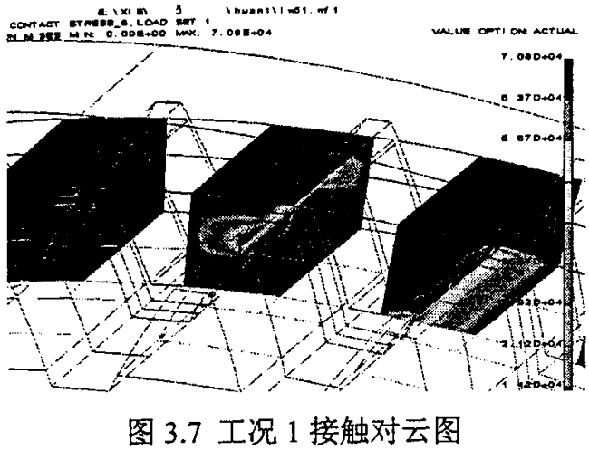 工況六至工況十這四和情況,是指兩環(huán)板之間不對稱,即偏心軸的兩個偏心拐的尺寸誤差不一致,這里考慮的是特殊狀況,從表3.10-3.13看出,當(dāng)兩環(huán)板不對稱時,將產(chǎn)生嚴(yán)重的載荷不均現(xiàn)象,載荷偏向中心距小的環(huán)板內(nèi)齒上,甚至只有一個環(huán)板承受載荷。由此說明,對于雙環(huán)減速器偏心軸有加工,應(yīng)特別注意兩曲捌的制造誤差,應(yīng)盡量使安裝好的兩環(huán)板具有較好的對稱性。圖3.7~圖3.12為六種工況下環(huán)板內(nèi)齒的接觸齒對的應(yīng)力云圖。