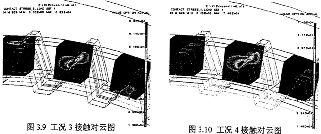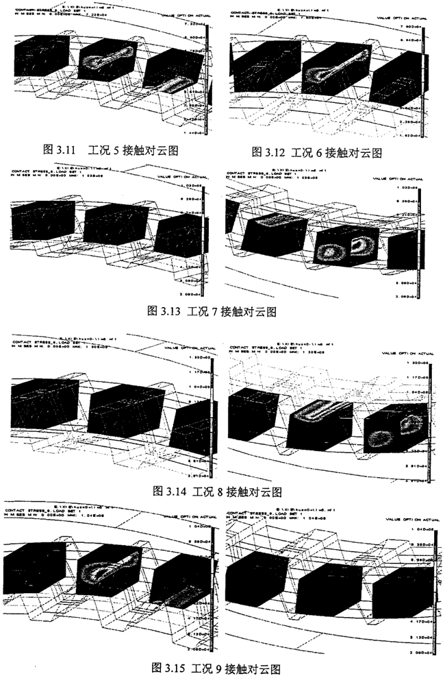 由表3.2~3.13可以看出,無論有無制造、安裝誤差的影響,隨著負(fù)荷的增加,齒輪實際嚙合接觸對數(shù)增加,但從計算結(jié)果分析證明,負(fù)荷對接觸對的影響小于誤差對接觸對的影響。對比表中的接觸對數(shù)和接觸應(yīng)力,數(shù)據(jù)表明當(dāng)齒厚發(fā)生變化時,實際接觸齒對數(shù)變化比較大,同時最大接觸應(yīng)力也有明顯變化。從變化的趨勢上看出與前面的理論推導(dǎo)變化趨勢相同,這里只是更加明顯。