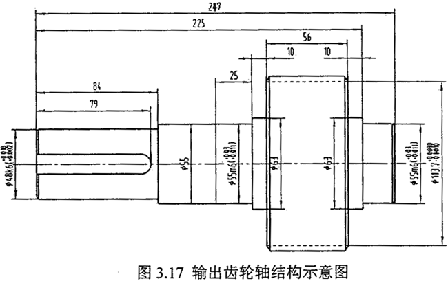 通常,實(shí)際工程結(jié)構(gòu)都是質(zhì)量、剛度和阻尼連續(xù)分布的連續(xù)系統(tǒng),其動(dòng)力學(xué)特性常常用偏微分方程組描述,但由于實(shí)際結(jié)構(gòu)的幾何形狀及邊界條件復(fù)雜,難以用解析法求解偏微分方程組。于是,通常對(duì)實(shí)際工程結(jié)構(gòu)離散化,將連續(xù)分布參數(shù)系統(tǒng)簡(jiǎn)化為具有有限多個(gè)自由度的集中參數(shù)系統(tǒng)。用矩陣表達(dá)式對(duì)每個(gè)單元進(jìn)行單元分析,根據(jù)虛位移原理建立單元的動(dòng)態(tài)平衡方程式;然后,作整體分析,得到整個(gè)結(jié)構(gòu)系統(tǒng)的動(dòng)力學(xué)方程式。應(yīng)用自由振動(dòng)邊界條件,得到由有限元法計(jì)算整個(gè)結(jié)構(gòu)系統(tǒng)固有振動(dòng)特性的基本方程。這樣,通過(guò)離散化模型,可將復(fù)雜的偏微分方程組簡(jiǎn)化為可以求解的常微分方程組,從而使問(wèn)題的求解大大簡(jiǎn)化。如前所述,雙環(huán)減速器結(jié)構(gòu)運(yùn)動(dòng)特性復(fù)雜,既有旋轉(zhuǎn)齒輪運(yùn)動(dòng),又有連桿平面運(yùn)動(dòng),根據(jù)這一具體情況,本文用集中參數(shù)法建立了該傳動(dòng)系統(tǒng)的彎——扭耦合振動(dòng)的動(dòng)力學(xué)分析模型。對(duì)箱體建立了有限元分析模型,該有限元模型的建立是用SDRC公司的I-Deas大型集成化軟件完成,并在此基礎(chǔ)上進(jìn)行動(dòng)力學(xué)響應(yīng)分析計(jì)算。當(dāng)進(jìn)行系統(tǒng)的模態(tài)計(jì)算時(shí),為了模型建立的方便,則將齒輪輪齒部分簡(jiǎn)化為分度圓柱,將齒輪和輪毅及輪毅與軸的緊配合聯(lián)接看成剛性聯(lián)接,忽略鍵槽、倒角和退刀槽的影響,利用自由網(wǎng)格劃分法(Free Meshing)對(duì)齒輪進(jìn)行有限元網(wǎng)格劃分。圖3.17為輸出齒輪軸的結(jié)構(gòu)示意圖,齒輪的有關(guān)參數(shù)見(jiàn)表2.1。物理參數(shù)為:彈性模量E=2.06×l011N/m2,泊松比為0.3, 材料密度p=7.8×103kg/m3。