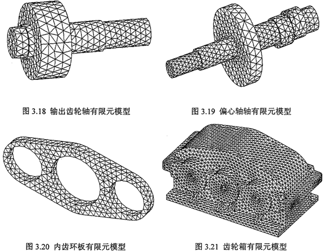 采用四節(jié)點(diǎn)四面體單元,利用軟件自由網(wǎng)格劃分法(Free Meshing )對(duì)輸出齒輪軸進(jìn)行有限元網(wǎng)格劃分。減速箱的其它零件采用相同的方法進(jìn)行有限元建模,圖3.18為輸出齒輪軸的有限元網(wǎng)格模型共劃分為3021個(gè)單元,835個(gè)節(jié)點(diǎn),圖3.19為偏心軸的有限元網(wǎng)格模型,共劃分為4098個(gè)單元,1188個(gè)節(jié)點(diǎn),圖3.20 為環(huán)板的有限元網(wǎng)格模型,共劃分為1505個(gè)單元,594個(gè)節(jié)點(diǎn)。