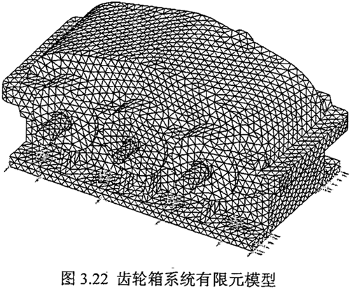雙環(huán)減速器箱體是用鑄鐵鑄造而成,不考慮或?qū)Ψ治鲇绊懮跷⒌慕Y(jié)構(gòu)特征,如小孔、園角、倒角、螺栓孔等,在進(jìn)行減速箱實(shí)體建模時(shí),忽略上述因素的影響,同時(shí)將箱蓋與箱體合為一體,而齒輪箱與前后端蓋、軸承組合而成,結(jié)構(gòu)比較復(fù)雜,建模時(shí)不考慮頂蓋與箱體、前后端蓋、軸承與箱體的接合部的影響。軸承采用相同尺寸的圓環(huán)套,而其材料性質(zhì)用具有與軸承等效剛度相同的材料參數(shù),這些處理不會(huì)對(duì)齒輪箱體的重量及剛度產(chǎn)生大的影響,完全能保證足夠的計(jì)算精度。用自由網(wǎng)格劃分方法(Free Meshing),采用八節(jié)點(diǎn)四面體單元?jiǎng)澐志W(wǎng)格,圖3.21為所建立的齒輪箱有限元模型網(wǎng)格,節(jié)點(diǎn)數(shù)為8761,單元數(shù)為28286。前面分別建立了齒輪系統(tǒng)主要零件和箱體的有限元網(wǎng)格,將簡(jiǎn)化后的軸承用相同的方法進(jìn)行有限元網(wǎng)格劃分,再用I-DEAS軟件的APPED命令將齒輪系統(tǒng)的各零部件集成為整個(gè)系統(tǒng)的有限元網(wǎng)格模型,如圖3.22 所示。