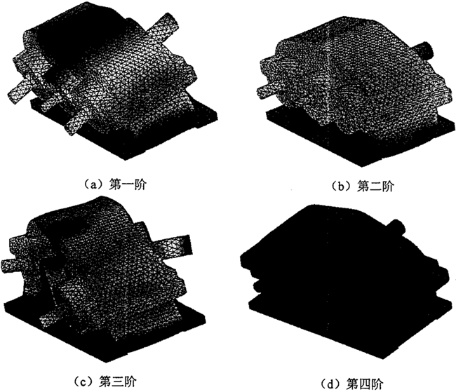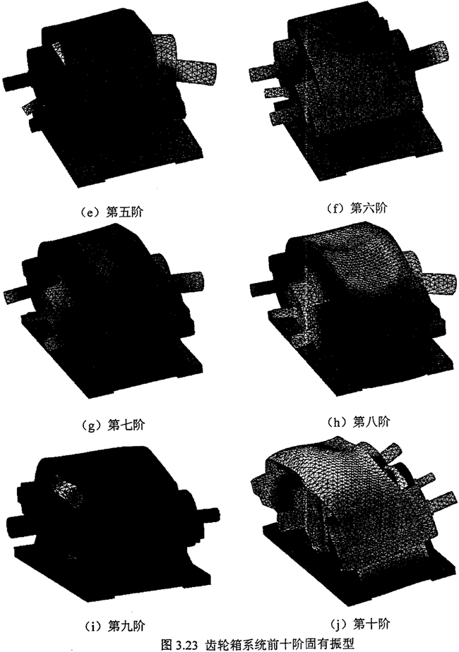如圖3.22 所示的齒輪系統(tǒng)有限元模型,根據(jù)實(shí)際的安裝情況,為了能比較準(zhǔn)確地反映實(shí)際狀態(tài),箱體的邊界條件為:箱體底座垂直方向約束,四個(gè)螺栓孔處全部固定約束。則研究齒輪系統(tǒng)的約束模態(tài),表3.14~3.15分別為用I-Deas軟件的Lanczos模態(tài)求解法計(jì)算得到的各重要零部件及齒輪系統(tǒng)前上10階固有頻率和響應(yīng)的振型情況。限于篇幅,圖3.23給出了齒輪系統(tǒng)的前十階固有振型。