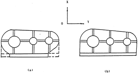 現(xiàn)在三環(huán)減速器箱體結(jié)構(gòu)一般參照通用減速器箱體結(jié)構(gòu)來設(shè)計的,如圖6-4(a)(b)和圖3-1示,這種結(jié)構(gòu)的y向剛度較小,為了增加y向剛度,應(yīng)設(shè)計成圖7-2(b)示形狀,顯然,圖7-2(b)的結(jié)構(gòu)剛度比圖7-2(a)結(jié)構(gòu)大。