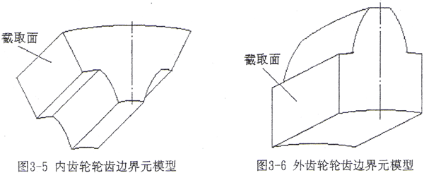 設(shè)內(nèi)齒輪為主動輪,將一輪齒從左右齒槽中點到輪體外圓以軸截面取出,如圖3-5所示。在輪體截取面上作用均布力,其約束為繞齒輪軸線轉(zhuǎn)動而不能有軸向位移。外齒為從動輪,將一輪齒從左右齒槽中點到齒輪內(nèi)孔以平行于輪齒中線和齒輪軸線的平面取出,如圖3-6所示。截面上的面力為未知,其約束為各方向位移為零。