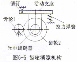 普通滾齒機(jī)具有刀架進(jìn)給絲桿的消隙機(jī)構(gòu),因此絲桿正反轉(zhuǎn)無間隙。齒輪的安裝有側(cè)隙存在,為了消除側(cè)隙對(duì)位移檢測影響,采用彈簧消隙機(jī)構(gòu),機(jī)構(gòu)簡圖如圖6-5所示。光電編碼器安裝在活動(dòng)座上,其軸上裝有齒輪2,齒輪1與刀架進(jìn)給絲桿固連,活動(dòng)支座在彈簧作用下繞銷釘轉(zhuǎn)動(dòng),壓迫齒輪2與齒輪1使其無側(cè)隙。由于光電編碼器的驅(qū)動(dòng)力矩非常小,因此所需的彈簧的拉力也很小,不會(huì)對(duì)光電編碼的正常工作造成不良影響。
