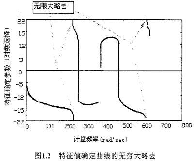 Pilkey和Leckie開(kāi)發(fā)的用于分析帶分支系統(tǒng)扭振系統(tǒng)的傳遞矩陣法包括將分支系統(tǒng)簡(jiǎn)化為一個(gè)等效單轉(zhuǎn)子系統(tǒng)。這種方法要求將分支系統(tǒng)的參數(shù)累加在分支系統(tǒng)所屬的軸段上。因?yàn)檫@種方法要求從主傳遞矩陣上消去分支系統(tǒng)的狀態(tài)關(guān)系,這會(huì)導(dǎo)致用根搜索法求解時(shí)丟到合理的根。如下圖1-2所示的一個(gè)頻率范圍內(nèi)的分支系統(tǒng)的特征曲線,因?yàn)闊o(wú)限大而略去的特點(diǎn)會(huì)導(dǎo)致丟根。