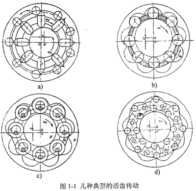 活齒少齒差行星傳動(dòng)簡(jiǎn)稱為活齒傳動(dòng),是由K-H-V型少齒差行星齒輪傳動(dòng)演化而成的一種新型齒輪傳動(dòng),并利用一組中間活動(dòng)件——活齒來(lái)傳遞兩同軸間的回轉(zhuǎn)運(yùn)動(dòng)。常見的活齒傳動(dòng)分為推桿活齒傳動(dòng)(圖1-la)、滾柱(鋼球)活齒傳動(dòng)(圖1-1b)、套筒活齒傳動(dòng)(圖1-1c)、擺動(dòng)活齒傳動(dòng)(圖1-ld)等。因?yàn)榛铨X傳動(dòng)具有結(jié)構(gòu)緊湊、傳動(dòng)比范圍廣、承載能力大、傳動(dòng)效率高等優(yōu)點(diǎn),所以它一出現(xiàn)就引起科技工作者的廣泛注意。