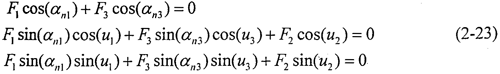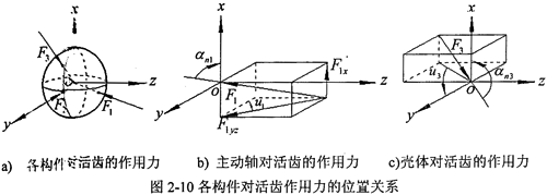 顯然F1、F2、F3組成一空間匯交力系,假設活齒在每個工作瞬時處于衡狀態(tài),根據(jù)圖2-10中各作用力的空間位置關系,可列方程如下: