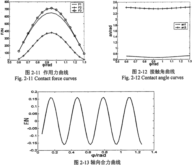 由圖2-11分析可知,在空間正弦軌跡曲線的拐點附近活齒受力最大,且作用在活齒上的三個力F1、F2、F3中,F(xiàn)3值最大,也就是說,在進行接觸強度計算的時候,應以活齒與殼體間的接觸情況為主要依據(jù)。接觸角αni(i=1,3)的求解為圓柱正弦活齒傳動的結構設計提供了必要的條件,它成為正弦滾過深度bi,(i=1,3)的主要度量依據(jù)。由圖2-13可以看出圓柱正弦活齒傳動主動軸上的軸向合力幾乎為零,且該傳動輸入軸的旋轉(zhuǎn)中心與其幾何中心重合,屬于自平衡結構,避免了慣性力的產(chǎn)生。因此只需采用單激波器的結構型式即可使慣性力和作用力達到平衡,縮短了傳動的運動鏈,減少了動力損耗,提高了傳動系統(tǒng)的效率和運動穩(wěn)定性。