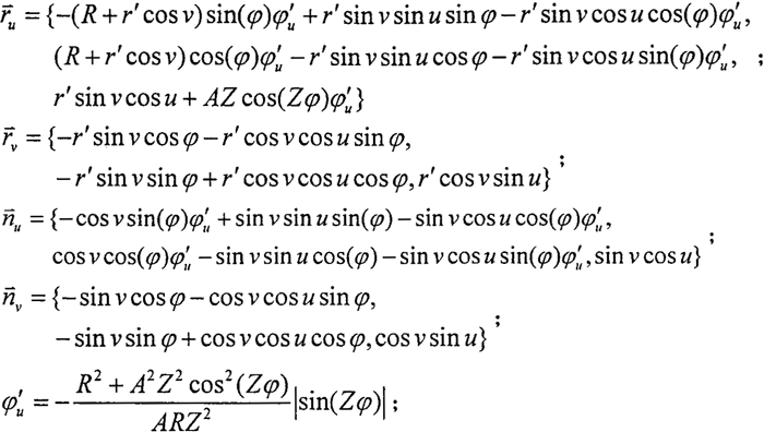 在進行圓柱正弦活齒傳動接觸強度分析時,需要利用正弦滾道齒面的主曲盆和主曲率半徑,為此需對正弦滾道齒面的主曲率和主曲率半徑進行分析計算。根據(jù)微分幾何理論,除在曲面上的奇異點之外,法曲率隨著所選取的方向下同而變化,而在一個非奇異的固定點,沿不同方向的法曲率之中有其最大值和最小值,而這最大值法曲率和最小值法曲率及分別稱為曲面在該點的兩個主曲率,當主曲率不為零時,主曲率的倒數(shù)稱為主曲率半徑;對應主曲率的方向稱為主方向,并且兩個主方向互相垂直。