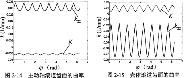 根據(jù)式(2-32),應用Matlab編程計算得到滾道齒面與活齒接觸點處的主曲率與全曲率的變化曲線如圖2-14、圖2-15。從圖中可見,主動軸正弦滾道齒面在接觸點處的全曲率恒為負值,根據(jù)微分幾何中的定義,則該接觸點為雙曲點,而殼體正弦滾道齒面在接觸點處的全碘率恒為正值,則該接觸點為隨圓點。從數(shù)值上看,曲率的變化范圍大,傳動比較平穩(wěn)。