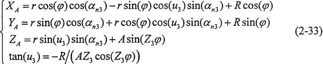 則矢量應平行于活齒中心的速度方向矢量{0,-tan(u3),1},據(jù)此條件,可以得到α=αn3-π/2。則旋轉(zhuǎn)軸的方向矢量為: