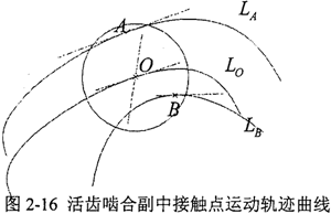 在圓柱正弦活齒傳動的一個活齒嚙合副中,活齒與殼體及主動軸的滾道分別在A、B點接觸,如圖2-16所示,接觸角近似取αn1n3=π/4,活齒在接觸點A、B的運動速度方向即為接觸點軌跡曲線LA及LB的切線方向,根據(jù)式(2-19),可知活齒與殼體接觸點A的運動軌跡曲線LA的方程: