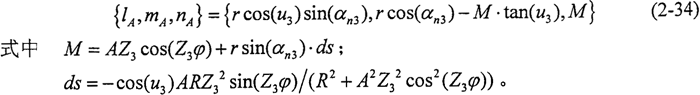 由式(2-33)可求得軌跡曲線LA的切線方程,為便于計算,將其轉(zhuǎn)換到活齒坐標系中,該方程的方向數(shù)為: