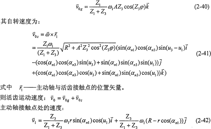 同理,由式(2-35)可以求得活齒中心的運動速度方向,轉(zhuǎn)換到活齒坐標系后,其方向數(shù)為: