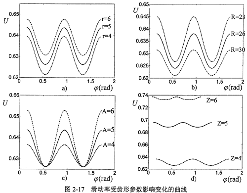 將相對速度矢量及主動軸接觸點處的速度投影到瞬時接觸線的法線方向得到v10t和,v1t,將二者代入式(2-38),計算出滑動率。由于正弦滾道形狀具有周期性,因此共軛齒面間的滑動率也呈現(xiàn)周期性變化,考慮齒形參數(shù)——活齒半徑r、活齒中心回轉(zhuǎn)半徑R、正弦幅值A及殼體滾道正弦周期數(shù)Z對滑動率的影響,若給定其中任意三個參數(shù),改變另一個參數(shù),可以得到在一個工作周期內(nèi)滑動率隨齒形參數(shù)的變化規(guī)律曲線如圖2-17所示。