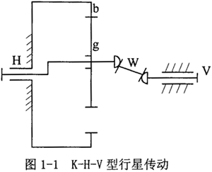 本文所研制的兩級(jí)三環(huán)減速器屬漸開線少齒差傳動(dòng)形式,有必要重點(diǎn)討論一下漸開線少齒差行星齒輪傳動(dòng)。當(dāng)漸開線內(nèi)嚙合圓柱齒輪副的內(nèi)齒輪和外齒輪齒數(shù)差很少時(shí)(一般為1~4個(gè))所組成的行星齒輪機(jī)構(gòu),稱為少齒差行星齒輪傳動(dòng)。如圖1-l所示的K-H-V型(也稱N型)是其主要形式,K-H-V型傳動(dòng),其內(nèi)齒圈b固定,轉(zhuǎn)臂H是輸入軸。由于它的轉(zhuǎn)動(dòng)和內(nèi)齒圈的限制,行星輪g作平面運(yùn)動(dòng),即行星輪既繞內(nèi)齒圈軸線作圓周平移運(yùn)動(dòng),又繞自身軸線作回轉(zhuǎn)運(yùn)動(dòng),再用輸出機(jī)構(gòu)W把行星輪的回轉(zhuǎn)運(yùn)動(dòng)傳遞給輸出軸,從而起到減速作用。