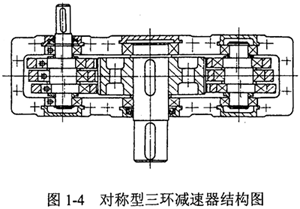 盡管我國在三環(huán)減速器的研究方面取得了許多令人矚目的成果,但由于三環(huán)減速器的研發(fā)時(shí)間較短,對(duì)有些問題研究的還不夠深入,生產(chǎn)中存在的一些實(shí)際問題還未從根本上得到解決,制約了這種新裝置的推廣使用。我國開發(fā)的三環(huán)減速器的基本型結(jié)構(gòu)主要有兩種,一是兩高速軸對(duì)稱布置于輸出軸兩側(cè)的對(duì)稱型三環(huán)減速器,如圖1-4所示,另一種是兩高速軸布置于輸出軸同側(cè)的偏置型三環(huán)減速器。