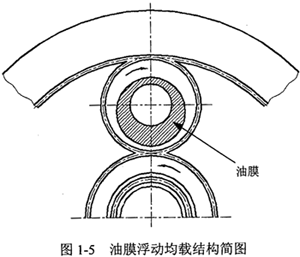 代表世界先進(jìn)水平的油膜浮動(dòng)均載裝置以其結(jié)構(gòu)緊湊、重量輕、成本低、安裝方便、減振性能好、對(duì)選用的行星輪數(shù)目不限、高低速行星傳動(dòng)均可采用、工作平穩(wěn)、均載效果好等一系列優(yōu)點(diǎn)受到國(guó)內(nèi)外許多生產(chǎn)廠家和研究機(jī)構(gòu)的重視。這是一種日本高橋崇等人發(fā)明的并取得多國(guó)專(zhuān)利的均載裝置,是利用厚油膜彈性作用使行星輪浮動(dòng)實(shí)現(xiàn)均載的,國(guó)外許多廠家(如日本的東洋精機(jī))已用此項(xiàng)發(fā)明生產(chǎn)了許多用于船舶蒸汽輪機(jī)、工業(yè)用齒輪減速器、甲板起重機(jī)減速器等裝置。由于該專(zhuān)利的關(guān)鍵技術(shù)資料十分保密,這引起許多國(guó)家探索其奧秘的興趣。這種均載方式是基于滑動(dòng)軸承理論,在行星輪與行星輪軸承(或心軸)之間裝入一中間環(huán),該環(huán)與行星輪孔之間留有徑向間隙并儲(chǔ)有潤(rùn)滑油。當(dāng)傳動(dòng)時(shí),行星輪與中間環(huán)以同一方向、同一轉(zhuǎn)速旋轉(zhuǎn),并承受方向相同的載荷,這個(gè)轉(zhuǎn)動(dòng)使它們之間形成了厚油膜實(shí)現(xiàn)行星輪浮動(dòng),厚油膜較普通滑動(dòng)軸承的油膜厚度大的多。當(dāng)行星輪間載荷分配不均衡時(shí),徑向力大時(shí)其油膜厚度相對(duì)最小,油楔夾角也隨之減小,即各行星輪對(duì)心軸產(chǎn)生不等量的位移從而實(shí)現(xiàn)均載。其原理如圖1-5所示。