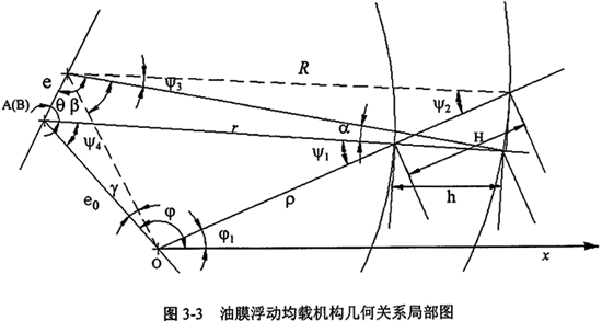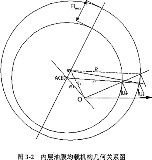 油膜浮動(dòng)均載機(jī)構(gòu)的幾何關(guān)系如圖3-2和圖3-3所示