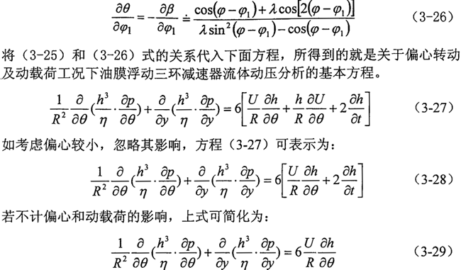 依據(jù)流體動(dòng)力潤滑理論,首次建立了偏心轉(zhuǎn)動(dòng)及動(dòng)載工況下三環(huán)減速器油膜浮動(dòng)的流體動(dòng)力潤滑方程,為其動(dòng)力學(xué)研究奠定了基礎(chǔ)。
