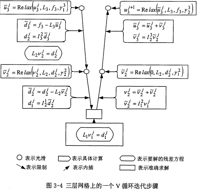 圖3-4所示為三層網(wǎng)格上的一個(gè)循環(huán)的具體計(jì)算步驟。