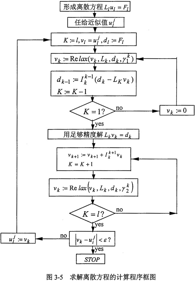 圖3-5所示為l個(gè)網(wǎng)格層上利用V循環(huán)求解離散方程(3-31)式計(jì)算框圖。