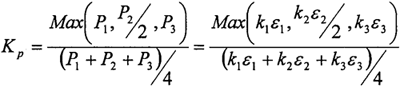 試驗(yàn)中選用的電阻應(yīng)變片長度為0.2mm,電阻為119.8±0.2Ω,相差很小,即k1、k2/2、k3彼此差別很小,所以上式簡化為: